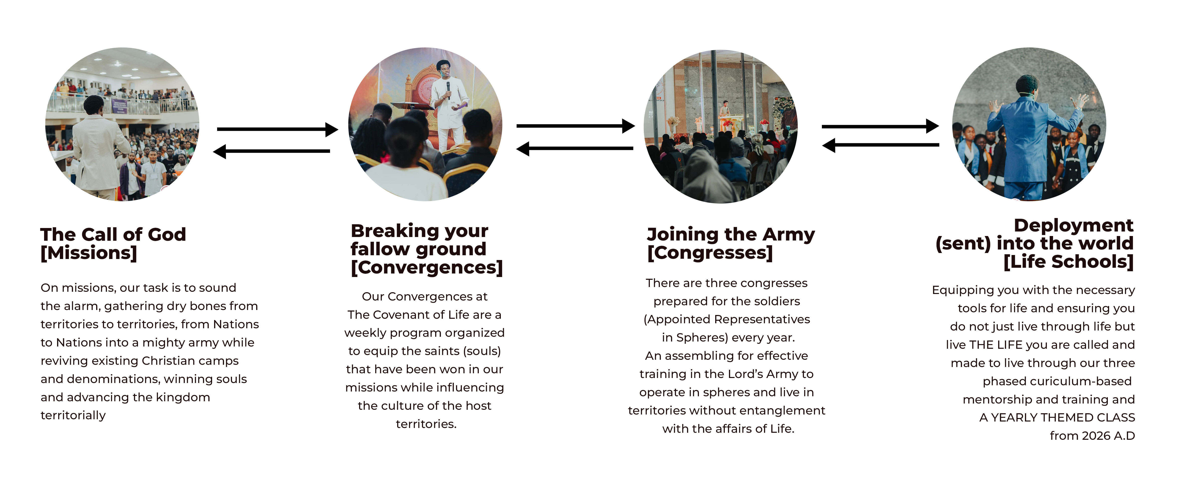 The Covenant of Life is a Prophetic and Apostolic Mandate, a New Creation Institution and a Non-Denominational Christian Organization created to engendering a Kingdom Army of Spirit-filled, thoroughly trained believers with a Passion to see God's Kingdom come as agents of Transformation taking the Value System and Culture of the Kingdom to every strata and sector of Human Existence;